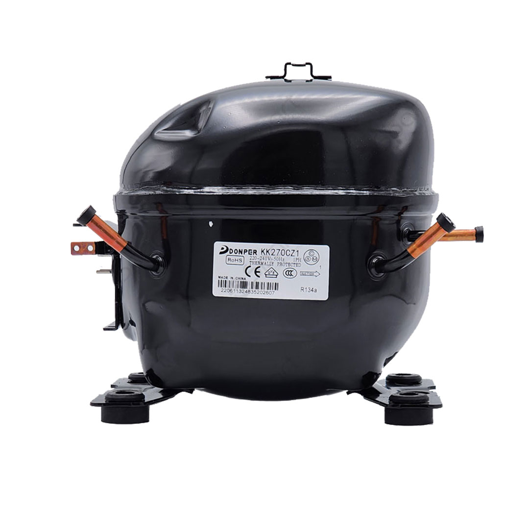 کمپرسور دانپر مدل KK270CZ1 با توان ⅓ اسب بخار (HP) و ظرفیت سرمایش 270 وات کار می کند. گاز مبرد استفاده شده در کمپرسور دانپر مدل KK270CZ1 گاز R134a است که از دسته هیدروفلوئورکربن یا HFC است و اثرات مخرب محیط زیستی به مراتب کمتری نسبت به سایر گازهای مبرد دارد. کمپرسور دانپر مدل KK270CZ1 در فریزر های صندوقی، یخچال ویترینی، فریزر آزمایشگاهی، یخ ساز و رطوبت گیر استفاده می شود، با یخچال های ساید بای ساید اسنوا، یخچال های الکترواستیل، هیوندای، پاکشوما، سامسونگ و دیپوینت سازگار است و با کمپرسور دانپر مدل LC126CY قابل جایگزین خواهد بود. با توجه به اینکه موتور کمپرسور یخچال از نوع موتور الکتریکی تک فاز است، در مدار آن استفاده از خازن ضروری است. خازن دائم کار کمپرسور برابر 5 میکروفاراد است و در مدار راه اندازی موتور آن، خازن راه انداز تعبیه نشده است. سیستم خنک کننده این کمپرسور نوع فن (Fan) است. سیستم خنک کننده فن به این صورت است که کمپرسور به وسیله یک فن خنک می شود.