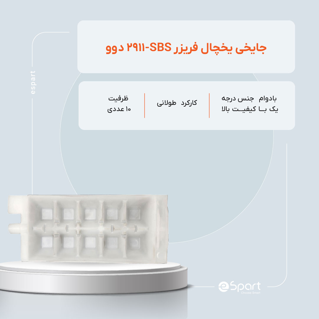 اگر به دنبال یک قطعه جانبی یخچال فریزر با کیفیت و بادوام هستید، جایخی SBS-2911 دوو یک انتخاب حرفهای برای یخچال ساید بای ساید شماست. این جایخی یخساز با ظرفیت ۱۰ عددی، طراحی مقاوم و جنس درجه یک، عملکرد طولانی و بدون مشکل را تضمین میکند. نصب آسان و سازگاری با مدلهای مختلف یخچال دوو و اسنوا (Snowa) این محصول را به یکی از پرطرفدارترین قطعات یدکی خانگی تبدیل کرده است.