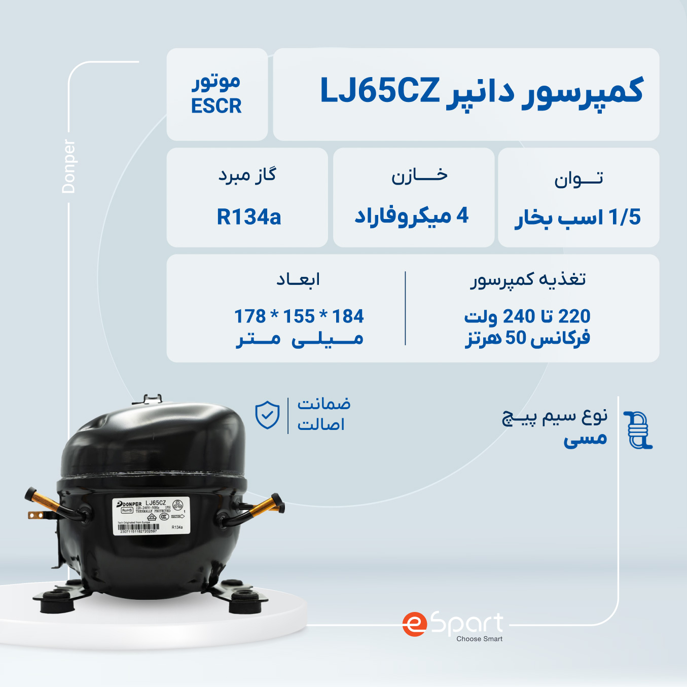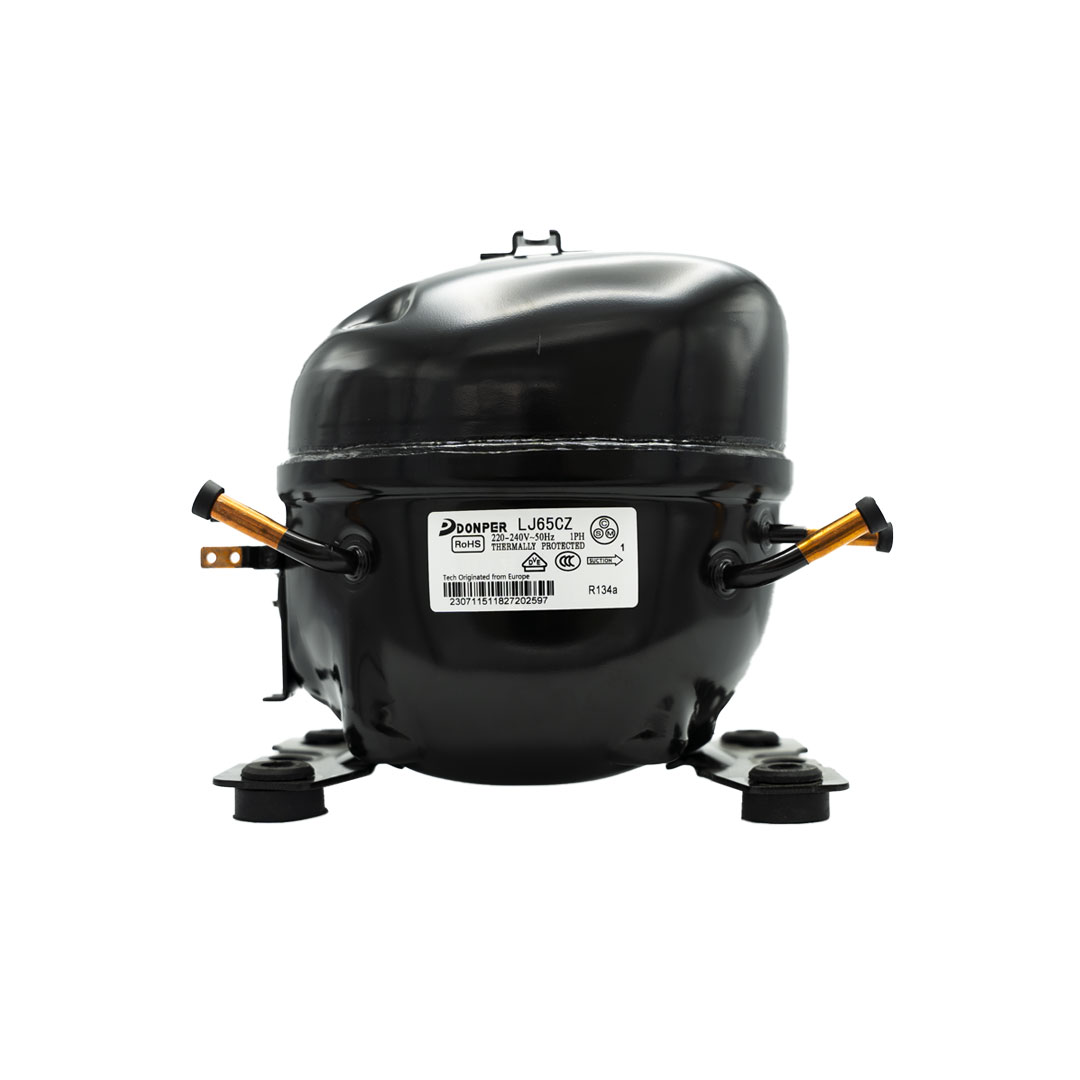 کمپرسور دانپر مدل LJ65CZ یکی از موتورهای پرکاربرد در صنایع تبرید خانگی است که به دلیل عملکرد بهینه و توان بالا، گزینه مناسبی برای استفاده در یخچال ‌های کوچک، ویترینی، رطوبت‌ گیر و فریزر صندوقی محسوب می‌ شود. این کمپرسور با توان 1/5 اسب بخار و بهره‌گیری از گاز مبرد R134a طراحی شده که یکی از پرکاربردترین و ایمن‌ ترین گازهای مورد استفاده در سیستم‌ های تبرید خانگی است. توان مصرفی و کارایی این کمپرسور به گونه‌ ای است که می ‌تواند نیازهای برودتی مختلفی را به خوبی پوشش دهد. یکی از وظایف اصلی کمپرسور در سیستم ‌های برودتی، فشرده ‌سازی گازمبرد و انتقال حرارت از داخل به خارج محفظه است. این کمپرسور با فشرده‌سازی گاز R134a و ایجاد جریان سرد، باعث خنک‌ سازی محیط داخلی دستگاه می‌ شود. پس از فشرده شدن گاز توسط کمپرسور، این گاز به کندانسور ارسال می‌ شود، جایی که حرارت اضافی از آن گرفته شده و دوباره به سیکل تبرید باز می‌ گردد. به همین دلیل، کمپرسورهای با توان و بازدهی بالا مانند مدل LJ65CZ، نقش کلیدی در بهبود راندمان دستگاه و کاهش مصرف انرژی دارند.