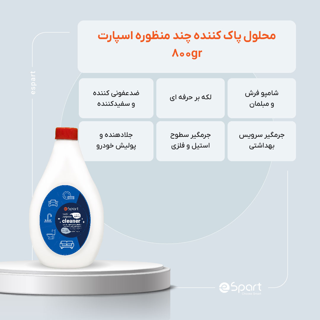 برای تمیز کردن سطوح مختلف مانند شیشه، چوب، فلز، پارچه و غیره، معمولا نیاز به استفاده از پاککنندههای متفاوت داریم. این مساله باعث میشود برای هر سطح یک محصول جداگانه و اغلب گرانقیمت تهیه کنیم. اما با محلول چندمنظوره اسپارت، دیگر نیازی به خرید چندین بطری پاککننده نخواهید داشت.