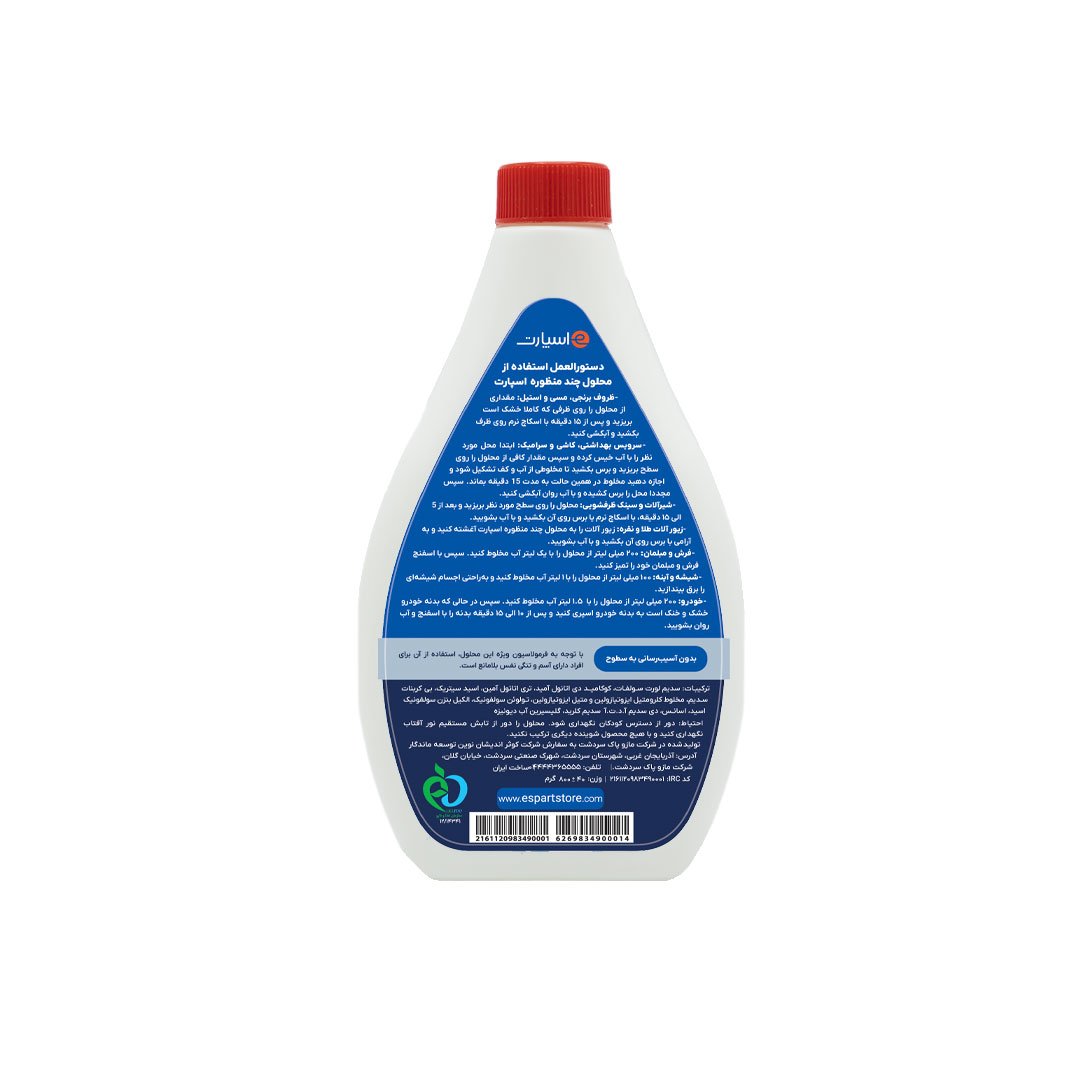 محلول پاککننده چندمنظوره اسپارت با فرمولاسیون پیشرفته خود، تمامی نیازهای نظافتی شما را به طور کامل برطرف میکند. این محصول بهعنوان یک شوینده، چربیزدا، لکهبر، رسوبزدا و ضدعفونیکننده عمل میکند و درخشندگی و پاکیزگی بینظیری را به انواع سطوح هدیه میدهد. این ویژگیها آن را به یکی از محبوبترین و پرفروشترین محصولات نظافتی اسپارت تبدیل کرده است.